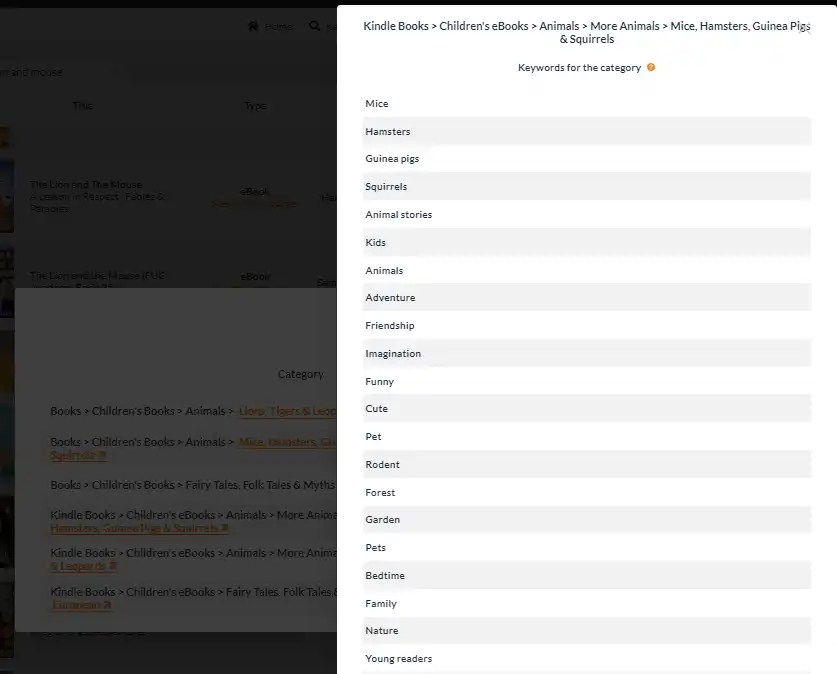So, the keyword list gives you words to enter in Amazon’s list of 7 keywords. In the case of The Lion and the Mouse, a number of the words aren’t useful. I can rule out all the animal names not a mouse and focus on keywords that describe the story instead. These include: animal stories, adventure, friendship, imagination, forest, and young readers.